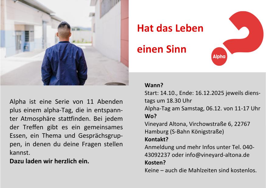 Dienstag, 14.10. um 18.30 Uhr (10 Abende bis 16.12.). Alpha-Kurs. Hat das Leben einen Sinn? Austausch über Lebensfragen und den christlichen Glauben. Anmeldung unter Tel. 040-43092237 oder info@vineyard-altona.de.
